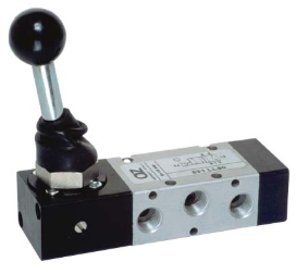 Zawór ręcznie sterowany 521 LL90 produkcji AZ Pneumatica. Zawór 5/2 bistabilny - nie posiada sprężyny powrotnej. Po zmianie położenia dźwigni (przepływu) pozostaje w zadanym położeniu do momentu ręcznego cofnięcia dźwigni.
