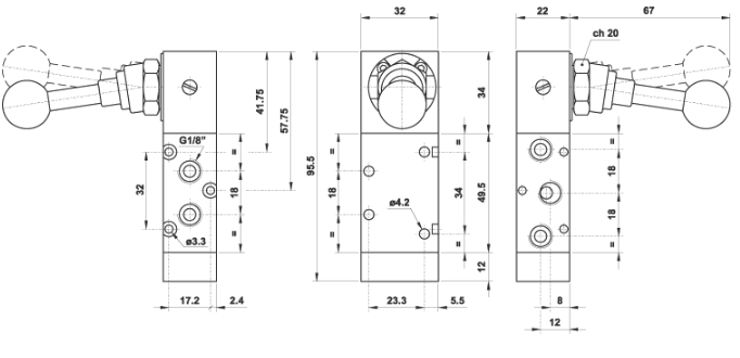 Zawór ręcznie sterowany 521 ML90 z dźwignią, 5/2 monostabilny do sterowania siłownikiem pneumatycznym. Posiada sprężynę zwrotną - po puszczeniu dźwigni wraca ona do położenia wyjściowego. Przepustowość zaworu to 550 l/min przy gwintach przyłącza 1/8".
