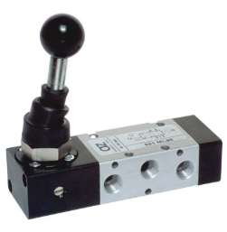Zawór ręczny z dźwignią 522 ML90 produkcji AZ Pneumatica. Zawór 5/2 monostabilny - po puszczeniu dźwigni powraca ona do położenia wyjściowego. Siłownik który jest sterowany zaworem po puszczeniu dźwigni wraca do położenia wyjściowego.