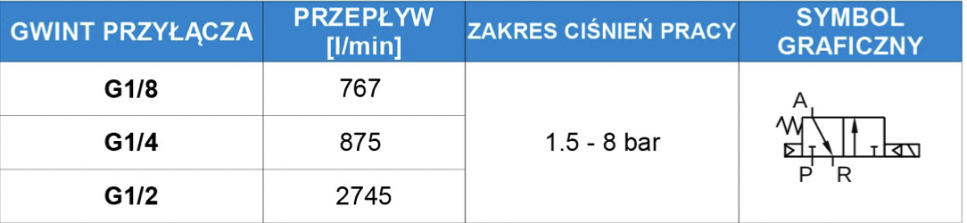 funkcje zaworów: 3/2 NC (normalnie zamknięty)