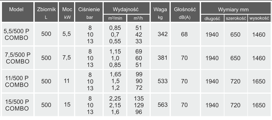 - sprężarki śrubowe na zbiorniku: kompresor zamontowany jest na zbiorniku w zależności od wersji 270 lub 500 litrowym. Takie rozwiązanie pozwala na oszczędność miejsca w sprężarkowni